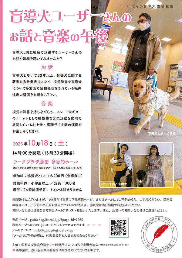 また、地元在住の盲導犬ユーザーで積極的な音楽活動を展開している村上ご夫妻によるフルートとギターの演奏(と軽妙なMC)をお楽しみください。
