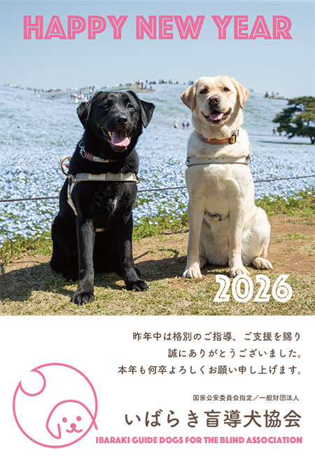 昨年中は大変お世話になりました。令和8年も盲導犬の育成を通して目の不自由な方々の自立と社会参加を支えるため、力を尽くしてまいります。私たちのような小さな団体では、皆様のご厚意のひとつひとつが、そのまま未来の盲導犬を育む力となります。本年も変わらぬご支援をどうぞよろしくお願いいたします。