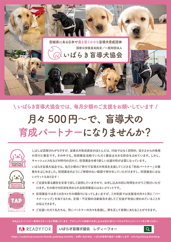 さて、いばらき盲導犬協会では、月々少額のご支援を募る「育成パートナー」のプロジェクトを始めました。ご賛同・ご支援をいただければとても助かります: